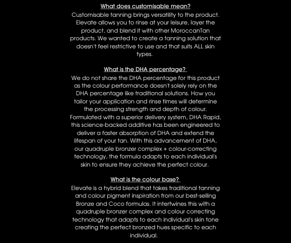 MoroccanElevate is a blend of high-performance DHA tanning actives and colour-correcting pigments that customise and adapt to every skin type. This unique blend creates a customisable tan that can achieve different results, from natural to dark bronzed hues.